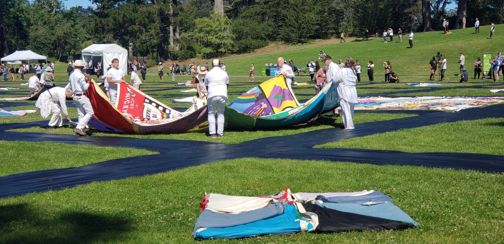 This morning I attended the opening ceremonies for the display of the AIDS Memorial Quilt. My friend Marjorie and I arrived at Robin Williams Meadow in Golden Gate Park as Quilt co-founder Mike Smith addressed the assembly. The quilt lay in sections, folded, each within a grassy rectangle demarcated by vinyl walkways. The day has been beautiful throughout. The vistas Golden Gate Park affords were particularly sharp today. The gathering was calm, peaceful, reflective. Toward the end of a succession of speakers’ addresses attendants began the ritual of unveiling the quilt sections while the names of those individuals represented by the displayed quilts were spoken. Only six percent of the entire quilt was on display.