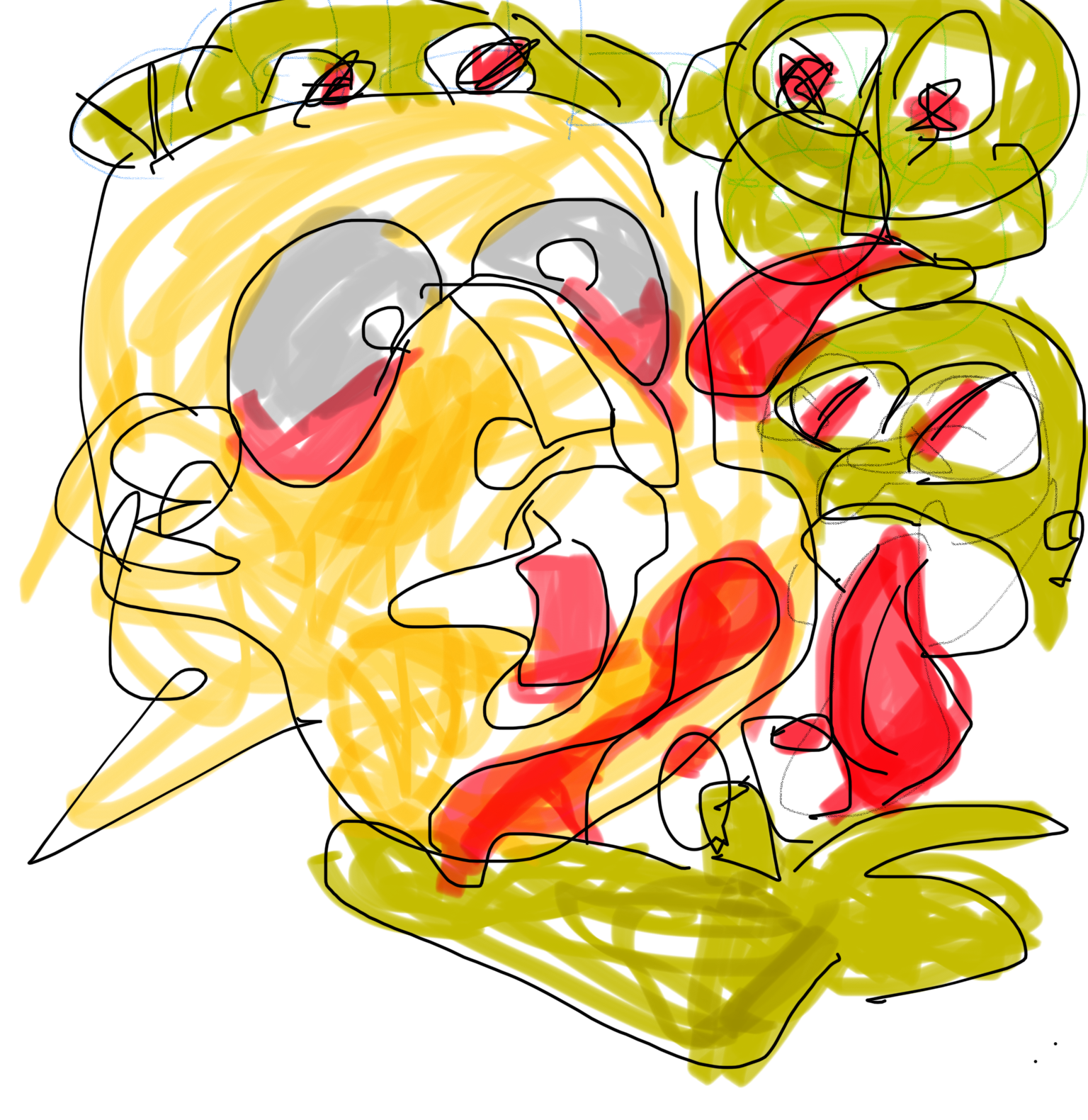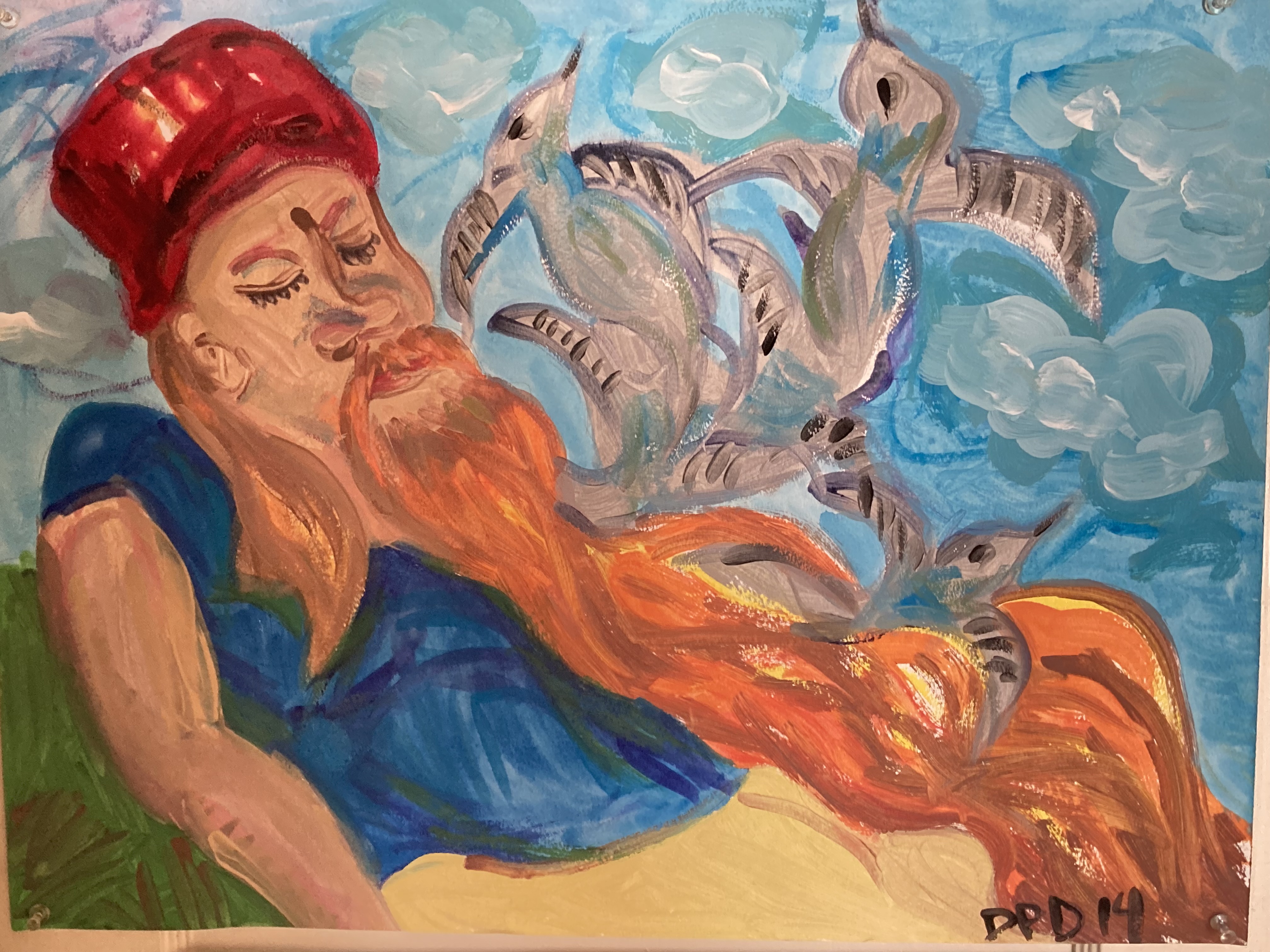 This tempera-on-paper play portrait of Brett Miller was created in 2014 while working in a former art room at The Arc San Francisco. Brett is a long-term fellow instructor and an inspiration. He remembers its creation, I do not. He shared the photograph with me recently saying he had finally gotten it framed and on a wall. Birds in flight are dreams in motion, emerging from Brett’s beard as they do. For more instances of work from my past, see the page Hayes Valley Art and Garden Walk.