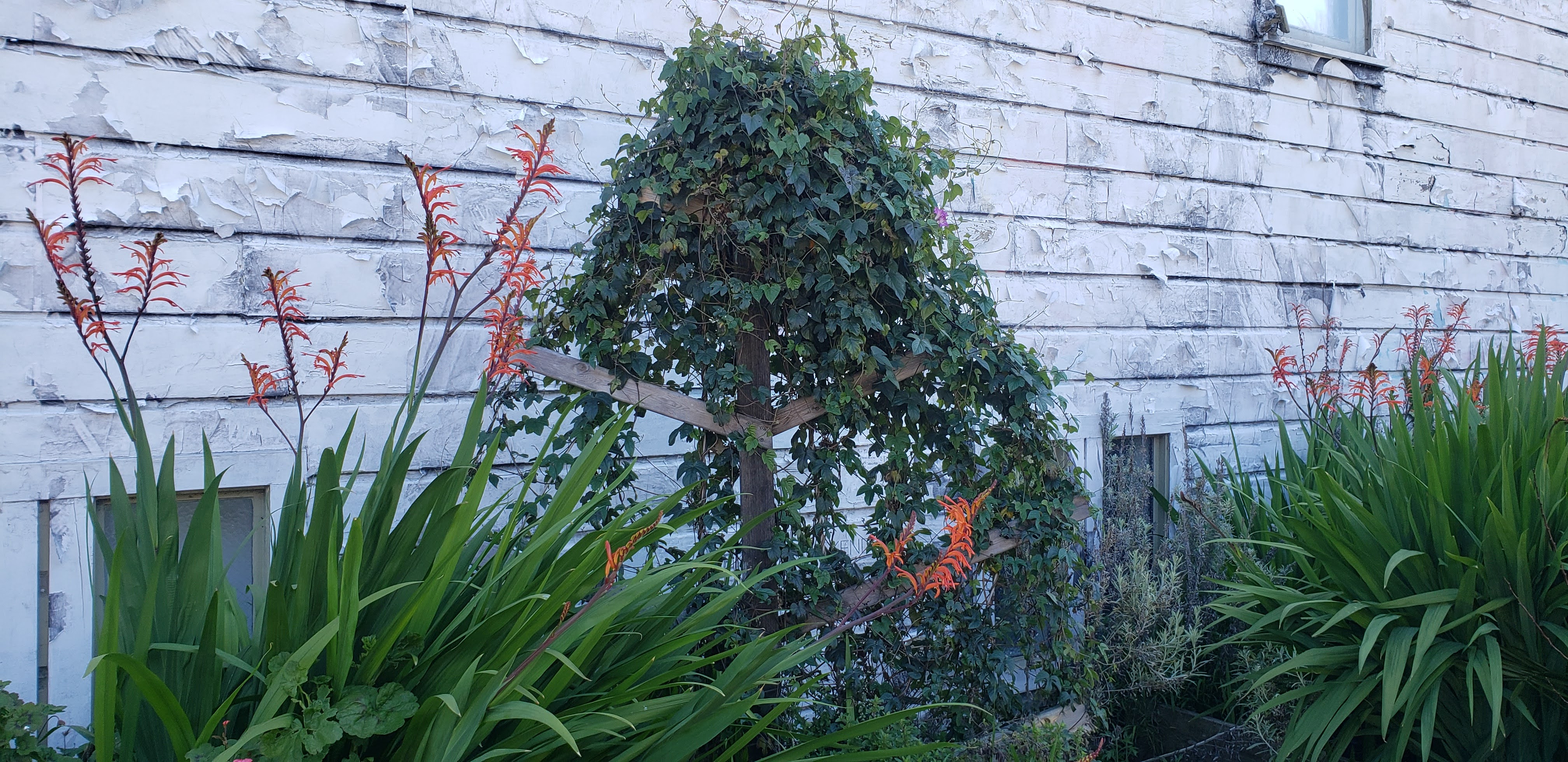 On January 6, 2021, I posted an image of a trellis that I had built at Hayes Valley Art Works. I was hoping to secure a cutting of jasmine for the structure. Following the advice of a friend, I visited an abandoned community garden at Mission Creek to find the jasmine vine. I love to scavenge and do so with purpose. We are a society of waste. The trellis was made from the slats of an abandoned futon frame. I repurpose. I found the vine without flower and was able to uproot a portion from the base of the fence surrounding the locked area. As it turned out, and to my ignorance, this was a morning glory vine. I am happy with the result.