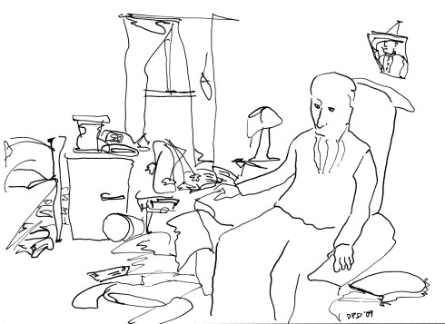 Untitled from Lives of the Obscure, 2009. Pen-and-ink on Bristol paper, 12 x 9 in. Collection of Gilbert Chan.