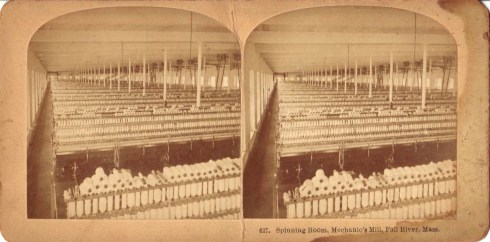 Spinning Room, Mechanic’s Mill, Fall River, Mass. Stereoscopic card. Kilburn Brothers, Littleton, New Hampshire, date unknown. Kilburn Brothers No. 617.