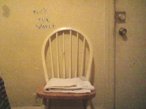 Number 20 is a quiet affair: one chair, one stool, one dresser, one closet, one wash stand with mirror, and a bed. On the dresser is a television. The hotel advertises cable TV. A towel, roll of toilet paper, and bar of Del Webb’s TownHouse soap are issued upon payment. There are bathrooms on each floor, but the only shower I have found is one floor down. The walls and other surfaces of unit 20 look as though every army in modern history has camped here. There are small peepholes through walls between units, peeling paint, and cockroach stains. Small, personal graffiti is everywhere, my favorite inscription written above a chair next to the door of the room.