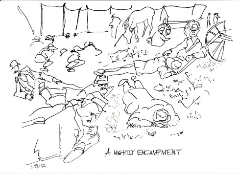 A Nightly Encampment, 2012. Pen-and-ink on Bristol paper, 9 x 12 in. Based on photograph.