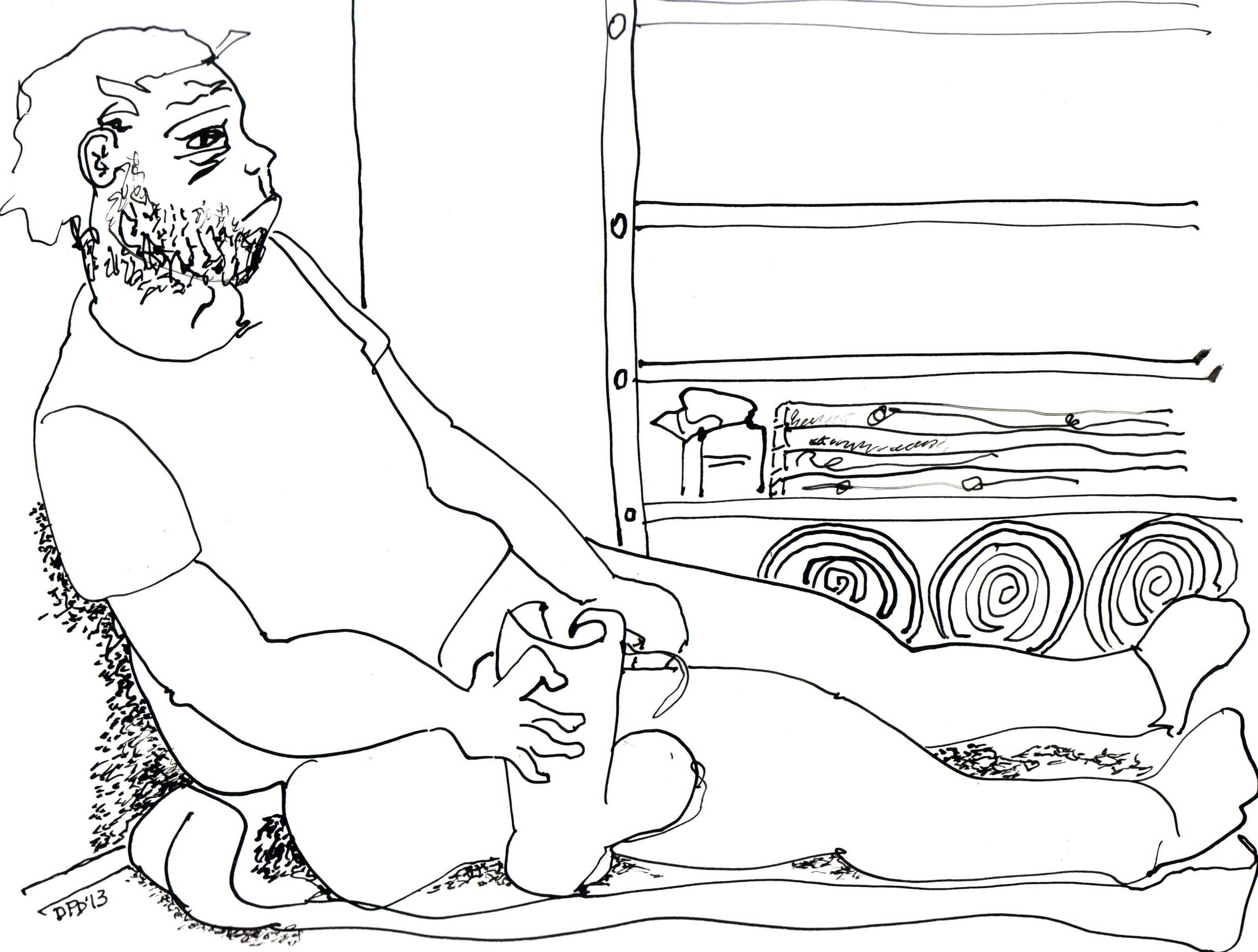 I’m not generally in the habit of answering to my name. It sounds unfamiliar to me like I couldn’t be the person he’s calling to. I shake my head and take off. The ground is wet and muddy. I drop my sign which I trip over and fall down. I get up slowly. My knees are hurting bad but I gain a little traction and keep on running. I really feel ashamed now.