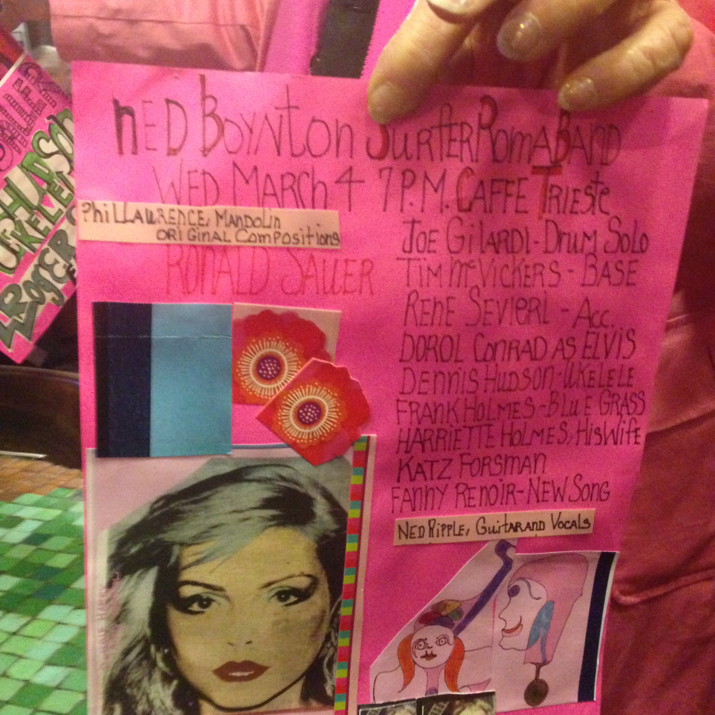 The first Wednesday evening of the month is host to the Ned Boynton Surfer Roma Band. You can also listen to Boynton play a lilting guitar on the juke box. The Surfa Roma Band is a changing ensemble from month to month. Of the eight members I listened to with great pleasure, there were musicians playing mandolin, accordian, guitar, bass, bongos, congas, and cymbals.