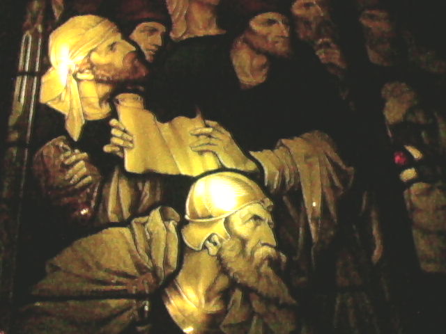 One of the anecdotes I opened with involved a conversation between two people from Ukiah, California, who walked past the Occupy SF encampment on Market Street in front of the Federal Reserve Bank of San Francisco, a site in use since early fall 2011. Dan was engaged in a conversation using his cell phone about company projects. Alma, his wife, and I were accompanying him to a local stationery store to purchase office supplies for the project where I am temporarily employed. We passed the camp, which is separated from the bank by a pedestrian throughway along the sidewalk and metal barricades at the bank’s portico edge . One couple struck me especially, a woman who was topless being held by a man, both swaying gently where they stood. I later thought of Paul Cadmus’s egg tempera painting What I Believe (1947-48), based on E.M. Forster’s essay of the same title; “Love and loyalty to an individual can run counter to the claims of the state. When they do ― down with the state, say I, which means that the state will down me” (see http://weimarart.blogspot.com/2010/10/paul-cadmus.html). In this painted idyllic vision of humanity, an area is taken up by individuals in peaceful assembly; the heterosexual couple to the right just beyond the grave could have been the couple Alma and I spotted that morning.